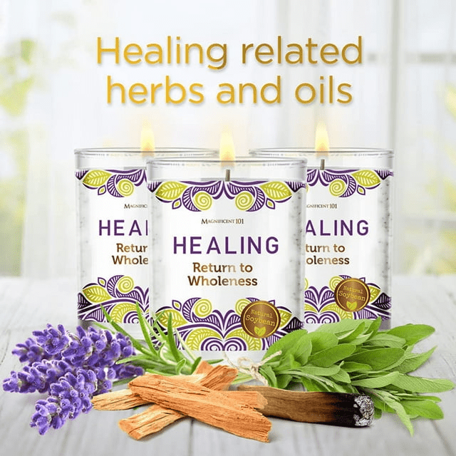 Set of 3 aromatherapy healing candles 10.5oz − made of natural soybean wax (sgs and msds report available - no petroleum or paraffin wax). Devoted to clearing and abundance blessings. This blend of abundance related herbs and essential oils is designed to create a natural abundance state in the home and body.This healing candle collection was designed for smudging, purification, stress relief, anxiety soothing, enhancing peaceful feelings and ultimately providing an energy boost. It provides a whole experience making it the perfect gift for women as well as men. Love, light, and positive energy goes into every candle.