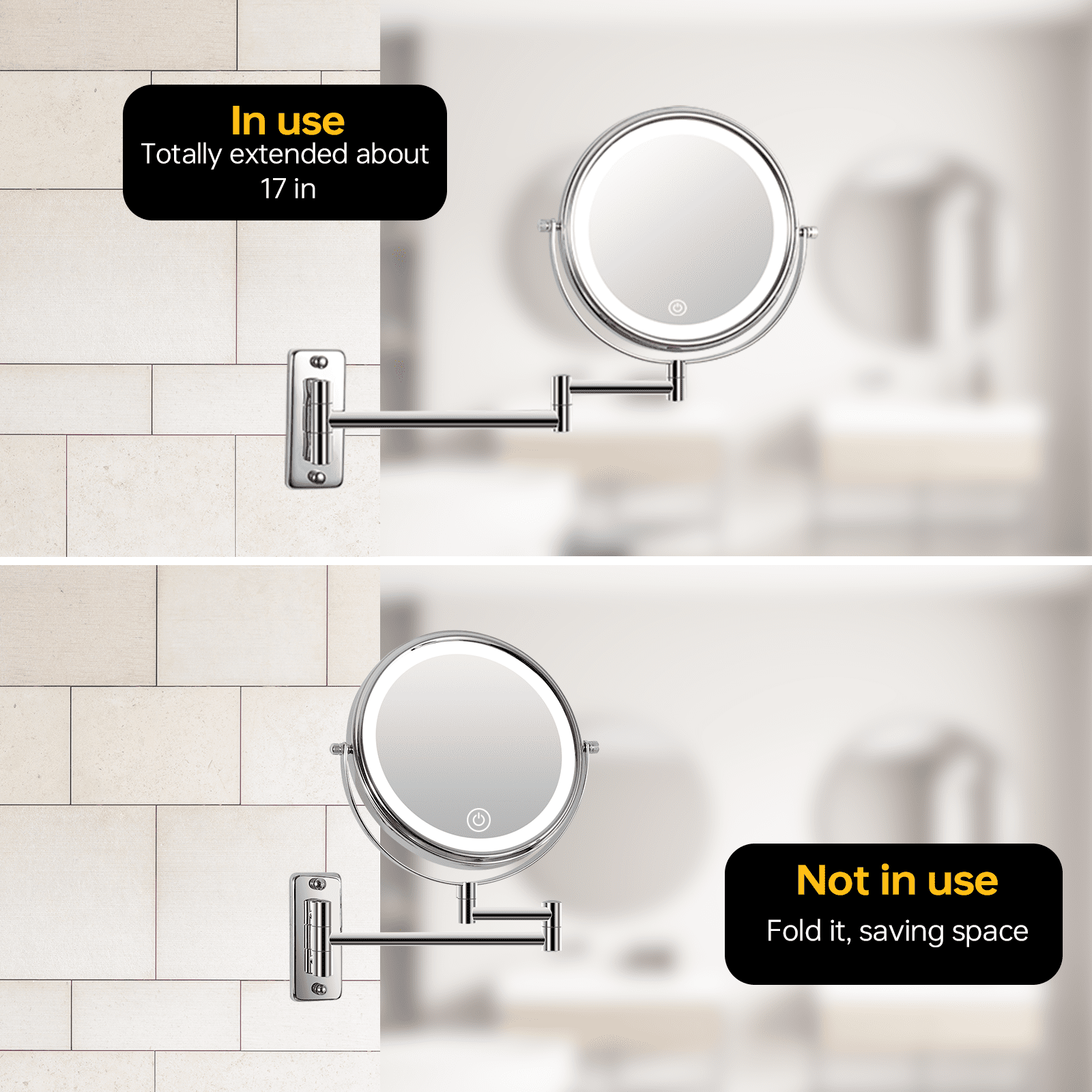 360° Swivel and Extendable Metal Arm: This makeup mirror is designed with an extending arm that you can smoothly extend and fold,and the long arm can be adjusted up and down to suit people with different needs.The max lenghs of extension arm is 14.7".